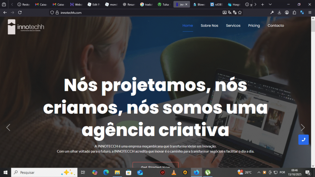 O design do website foi pensado para transmitir confiança, tecnologia e modernidade, refletindo a essência da marca INNOTECH.